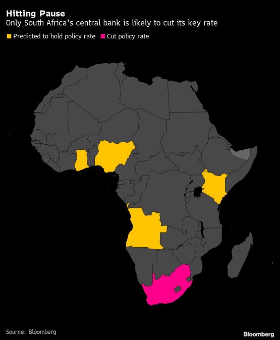 South Africa’s monetary policy committee may take advantage of the scope to lower its benchmark rate even further, while those in Nigeria, Angola, Ghana and Kenya contend with currency weakness and rising consumer prices.