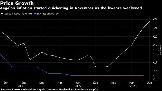 Angola’s central bank hasn’t cut its policy rate this year and is unlikely to do so now, even as the economy faces a triple shock due to the virus, a steep decline in oil prices and a reduction in crude output to meet its OPEC+ commitment. That’s because consumer prices have been fuelled by the kwanza that’s lost 15% of its value against the dollar this year.