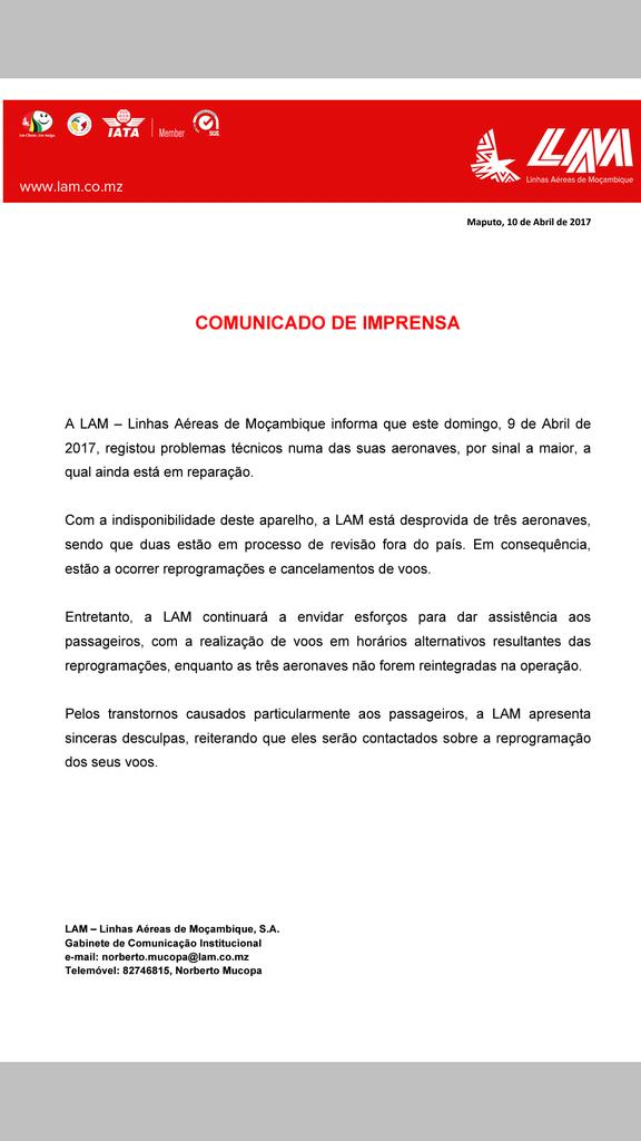 Mozambican Airlines informs that it is currently cancelling and reschedule flights due to technical problems in one of its aircraft.