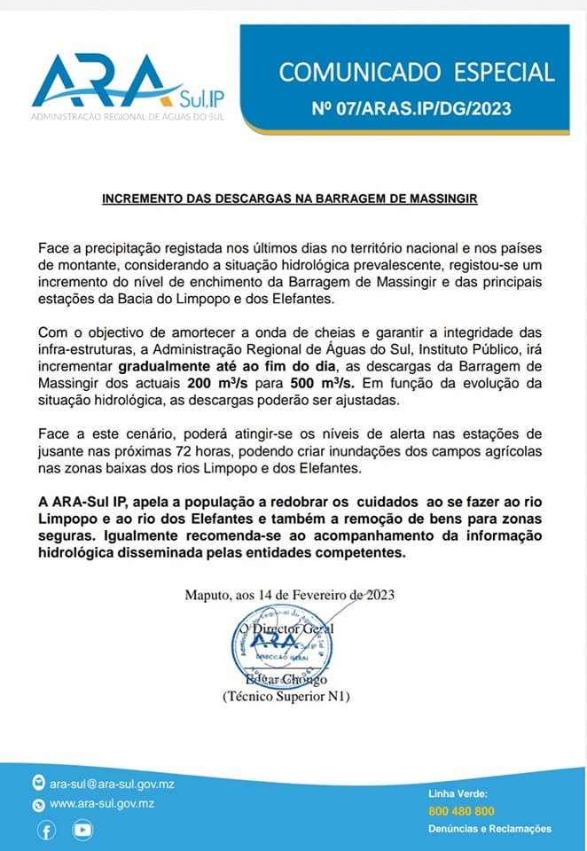 The Massingir dam will gradually increase discharges over the next few hours from the current 500m3/s to 1,000m3/s, and these levels may be exceeded depending on the evolution of flows.
