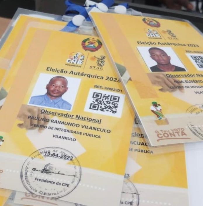 The chair of the Ilha de Moçambique district elections commission (CDE) has stopped reporting and observation by our correspondents, saying he does not recognise badges issued by the Nampula provincial elections commission (CPE). He says the CPE should have issued a “credential” and not a plastic coated badge on a string as issued by all provinces. The photo shows badges issued in Inhambane.