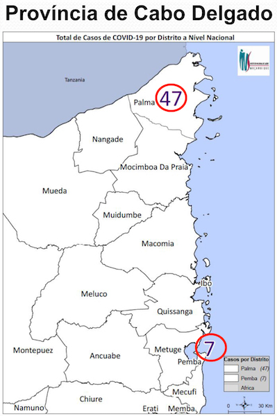 The epicentre of the Covid-19 pandemic in Mozambique is currently the three Total camps on the Afungi peninsula, where 47 infected people are convalescing at home, and where transmission is still active, with another seven patients in the city of Pemba.