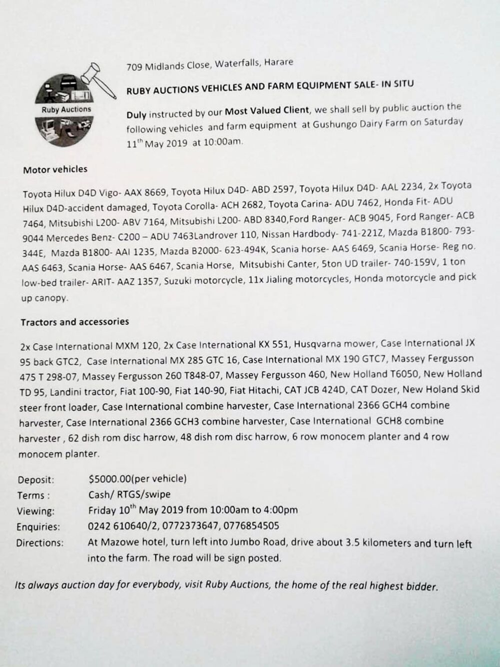 “Duly instructed by our most valued client we shall sell by public auction vehicles and farm equipment at Gushungo Dairy Farm on Saturday,” the auctioneer Ruby Auctions said in a newspaper notice inviting bidders to the sale on the farm.