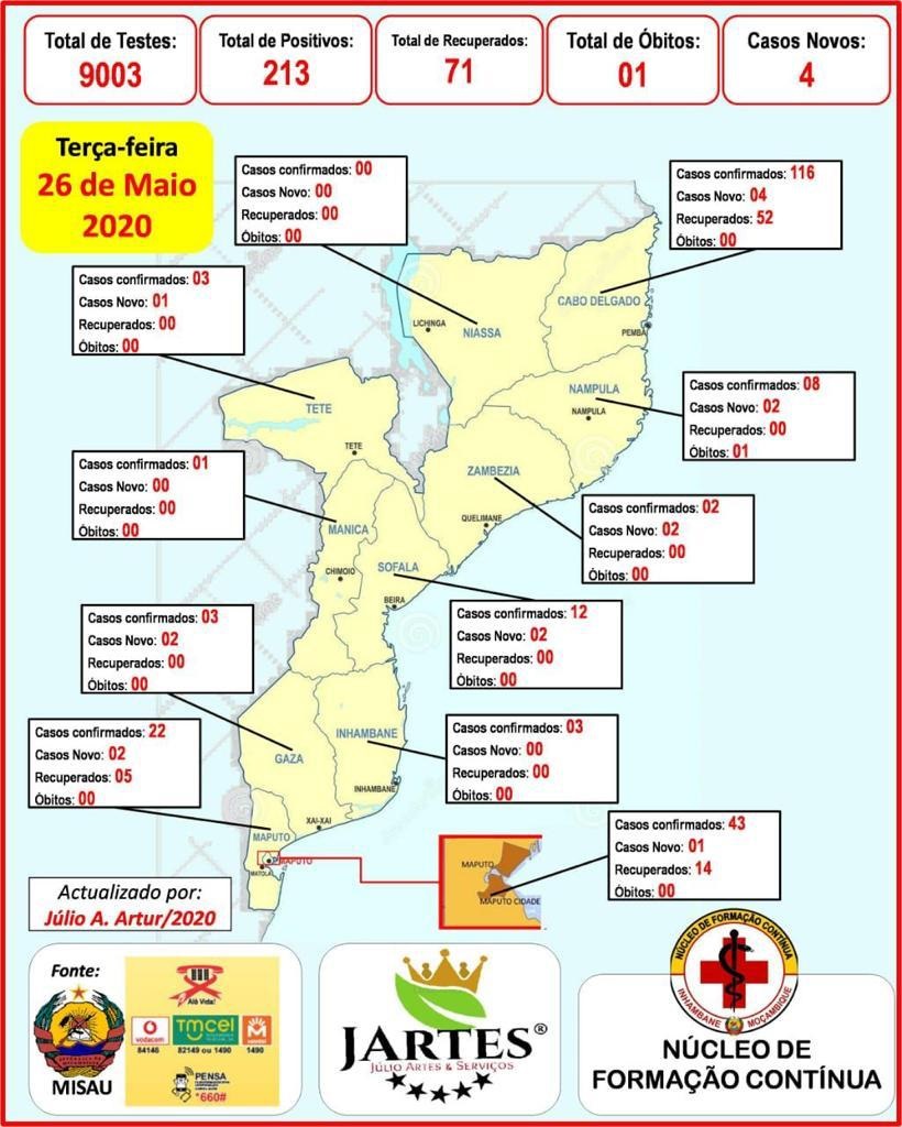 The distribution of the 213 positive cases by province, as of Tuesday, is as follows: Cabo Delgado, 116; Maputo City, 43; Maputo province. 22; Sofala, 12; Nampula, eight; Inhambane, three; Tete, three; Gaza, three; Zambezia, two; and Manica, one.