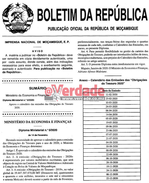 @Verdade meanwhile established on Tuesday (10) that the Government placed on the market a 3rd Series of Treasury Bonds of 2020, in order to obtain an additional 3 billion meticais at an interest rate of 12 percent.
