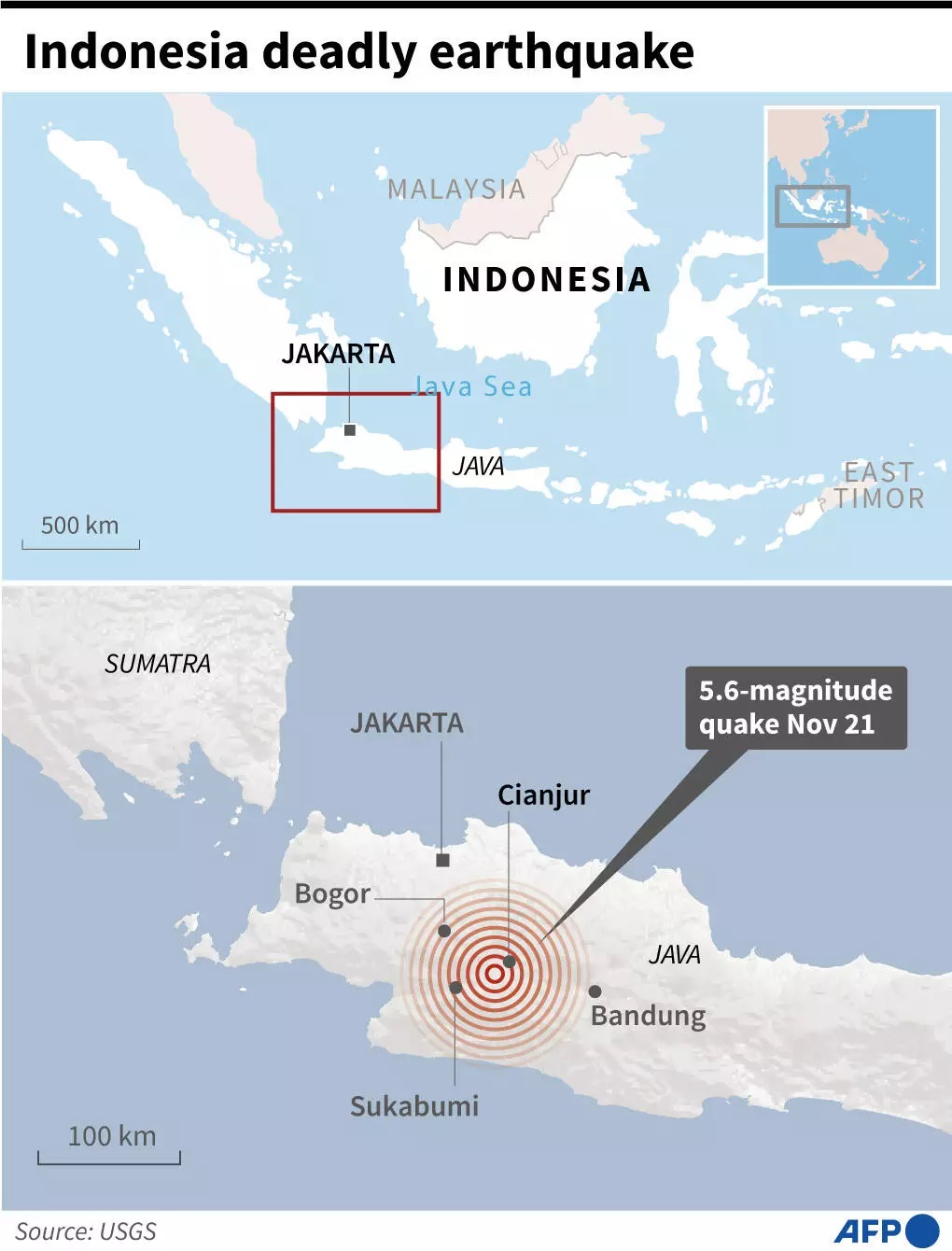 The epicentre of the shallow 5.6-magnitude quake on Monday was near the town of Cianjur in Indonesia’s most populous province West Java, where most of the victims were killed when buildings fell and landslides were triggered.