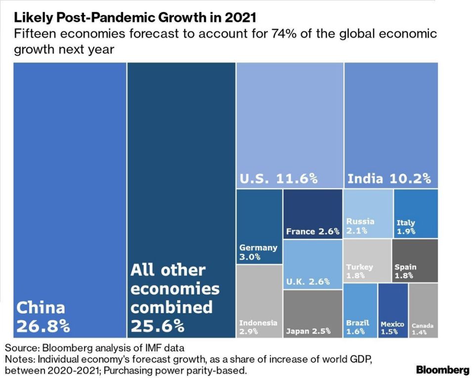 The IMF estimates China will grow by 8.2% next year, down a full percentage point from the IMF’s April estimate but strong enough to account for more than one-quarter of global growth. The U.S. is expected to rally to a 3.1% increase which will account for 11.6% of global growth in 2021 in purchasing power parity terms.