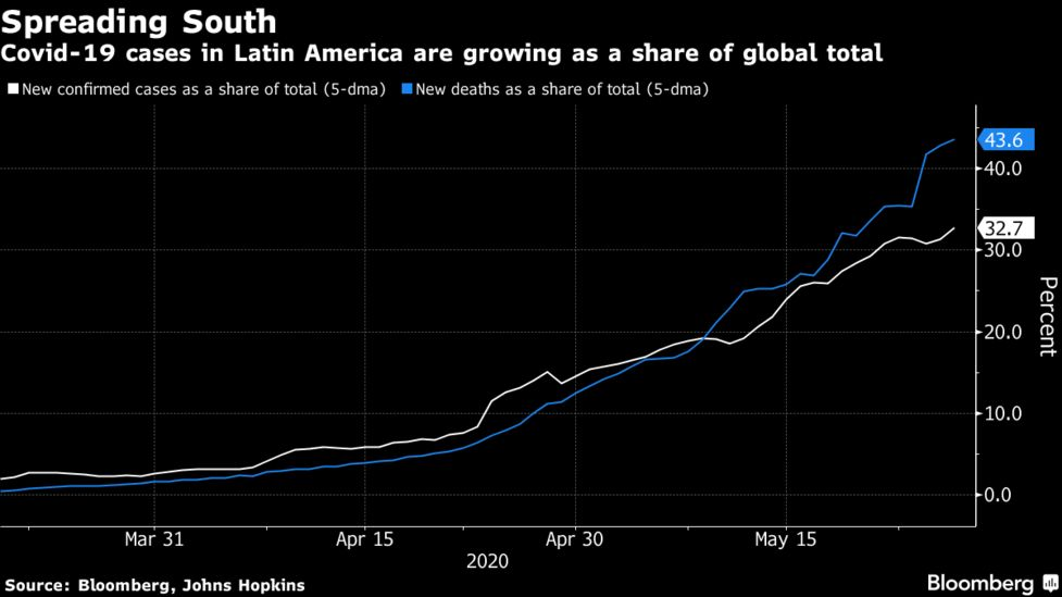 “Many of the region’s largest cities are still several weeks away from their peaks,” said James Bosworth, author of the weekly newsletter Latin America Risk Report. “Hospitals will run at capacity for a long time, straining the healthcare systems. Even those cities and countries that do peak will see a multi-week plateau and a gradual descent rather than a sharp drop in cases.”