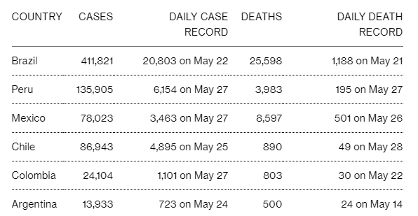 The statistics are chilling: Brazil has more cases than any country except the US and some models forecast that deaths, currently at 25,000, could more than quadruple in coming months. Mexico had its largest single increase in cases and deaths this week and a top health official said about 30,000 people may die. Peru, Chile and Colombia have all set daily records in the past week.