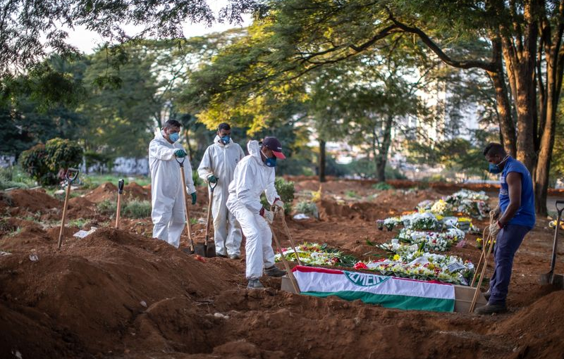 Workers wearing protective gear lower the casket of a Covid-19 victim at the Vila Formosa cemetery in Sao Paulo, Brazil, on Wednesday, April 29, 2020. [Photo: Jonne Roriz/Bloomberg]