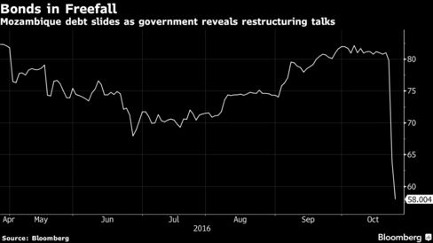 The $727 million security has fallen 22 cents on the dollar to 59 cents since the African nation revealed on Tuesday it hired Lazard Ltd. and White & Case LLP to oversee meetings with creditors to change terms on its debt to qualify for a resumption of International Monetary Fund aid. Mozambique’s external burden amounts to $10.1 billion, including $1.73 billion of liabilities to commercial creditors, according to a presentation posted on the Finance Ministry’s website.