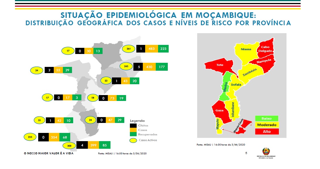 The majority of active cases are in Maputo City and Cabo Delgado province, with 303 and 261 people infected respectively, followed by Maputo province with 255 and Nampula with 245 infections. The remaining seven provinces of the country register less than 60 cases.