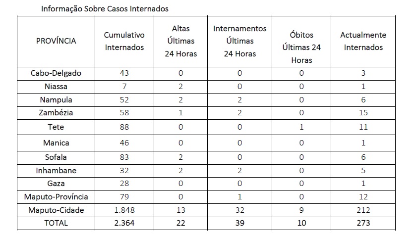273 patients are currently hospitalised in health units across the country: 212 (77.7%) in Maputo city, 15 in Zambézia, 12 in Maputo province, 11 in Tete province, six in Sofala, six in Nampula province, five in Inhambane province, three in cabo Delgado, one in Manica province, one in Gaza and one in Niassa.