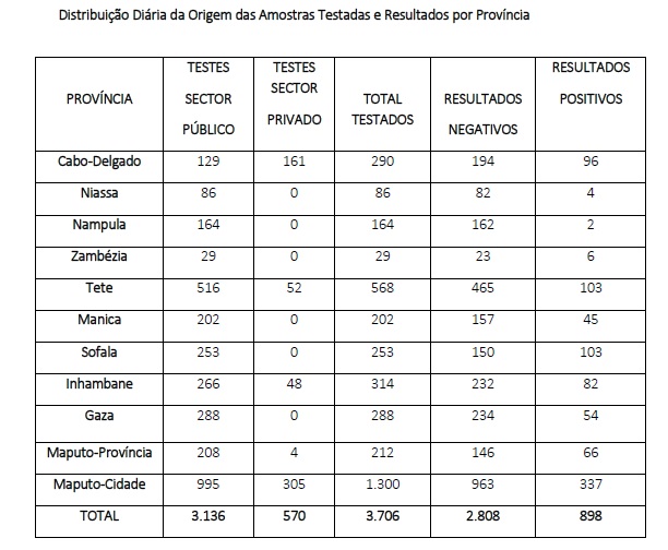 The City of Maputo registered 337 new cases, corresponding to 37.6% of the total new cases reported across the country, followed by the provinces of Sofala and Tete with 103 cases each, corresponding to 11.5%.