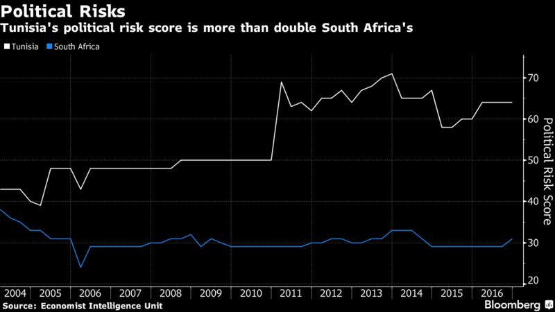 Tunisia has a 3.5 percent chance of missing payments, the third-highest in Africa. The north African nation, which has suffered from terrorist attacks against tourists and been hit by industrial strikes, has a political risk score of 64, according to the Economist Intelligence Unit. That’s more than double South Africa’s 31 and higher than Turkey’s 55.