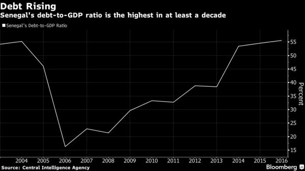 With a 5.6 percent probability, Senegal is the African bond issuer most likely to default in the next 12 months, according to Bloomberg’s model. Almost one-fifth of banks’ loans are classified as non-performing and at 56 percent, the government’s ratio of debt to gross domestic product is now higher than when it was given relief under the Heavily Indebted Poor Countries Initiative, or HIPC, a decade ago.