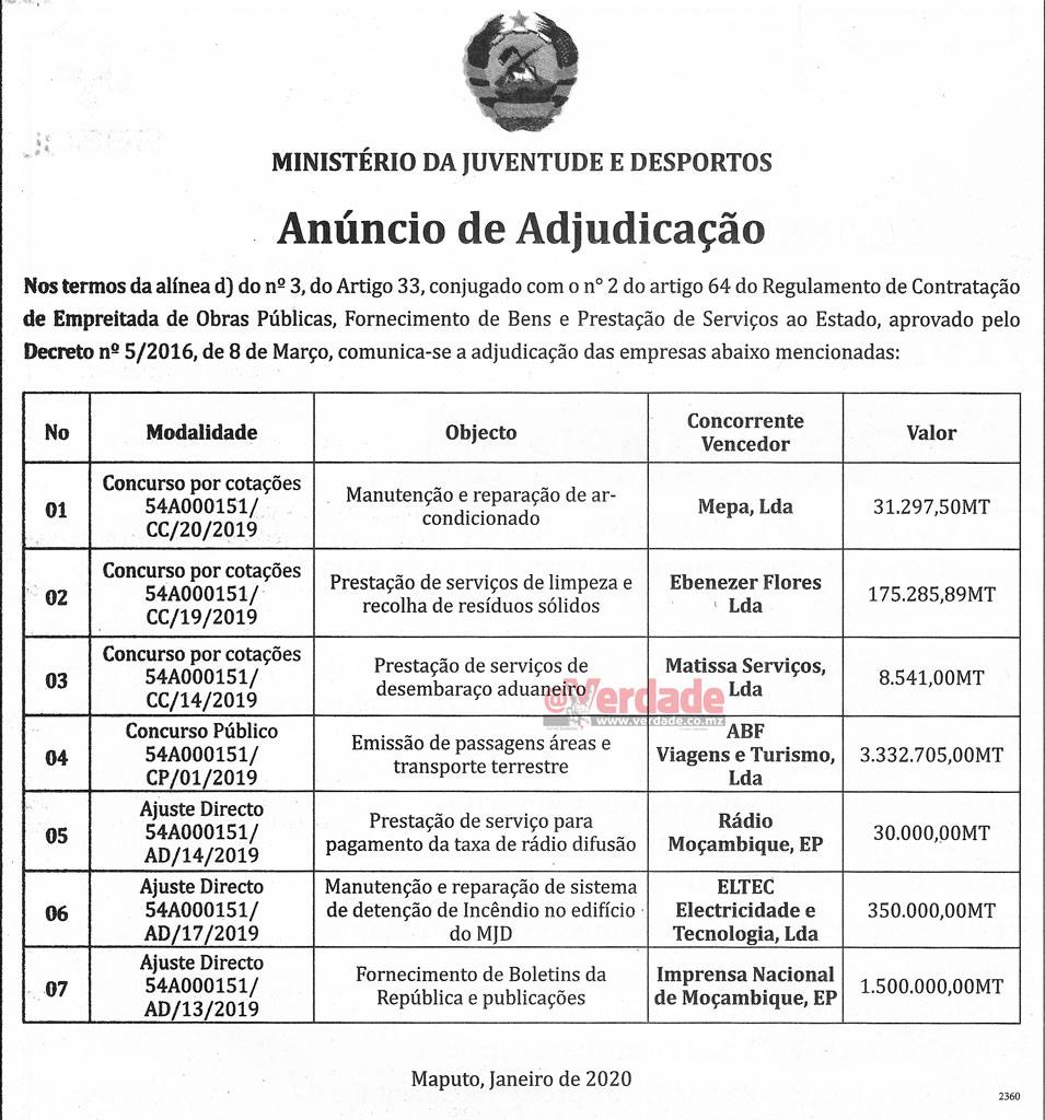 President Nyusi has not yet defined the duties and powers of the Secretary of State for Sports, and in the meantime the defunct Ministry of Youth and Sports continues to incur expenses of doubtful justification, such as the purchase of air and land travel tickets worth 3.3 million meticais, or the alleged payment of 1.5 million meticais to the National Press [Imprensa Nacional] for the supply of Government Gazettes [Boletins da República].