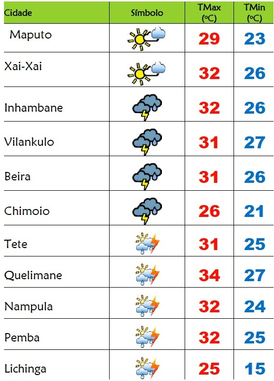 In the provinces of Inhambane, Gaza and Maputo, INAM forecasts cloudy or very cloudy skies, thunderstorms and showers or locally moderate light rain and light to moderate southwest to southeast winds, sometimes with gusts.