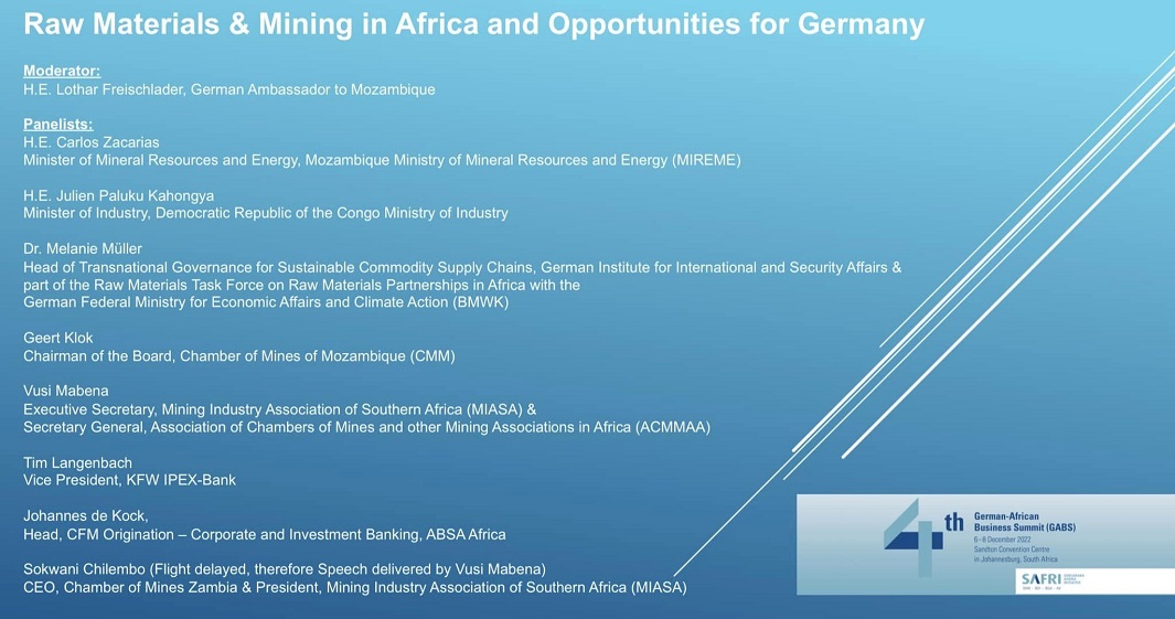 The panel was moderated by Lothar Freischlader, German Ambassador to Mozambique. Participants included Julien Paluku Kahongya, Minister of Industry of the Democratic Republic of the Congo; Melanie Muller; Sokwani Chilembo, CEO of the Chamber of Mines Zambia and president of the Mining Industry Association of Southern Africa (MIASA); Geert Klok, Chairman of the Board of the Chamber of Mines of Mozambique (CMM); and Tim Langenbach, Vice President, KFW-IPEX.
