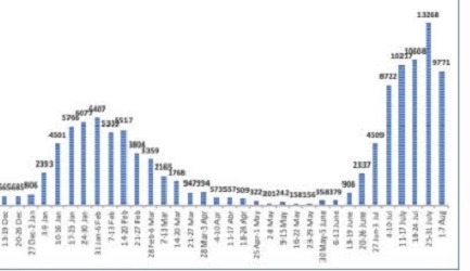 Miguel de Brito’s weekly charts to Saturday 7 August show the peak: