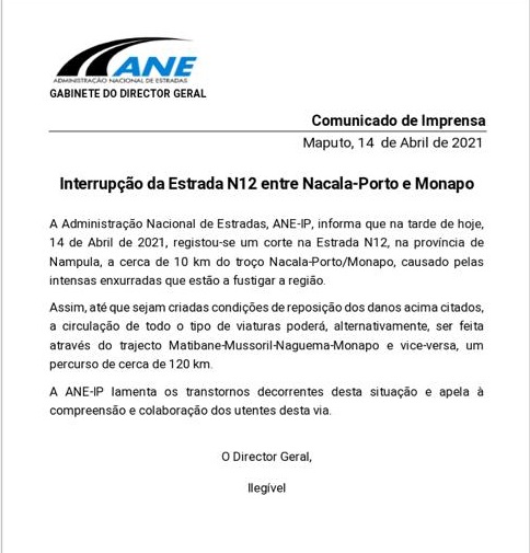 In a communique, the ANE explains that “until conditions are created to restore the damage, all types of vehicles may alternatively circulate via Matibane-Mussoril-Naguema-Monapo and vice versa” – a 120-kilometre detour.