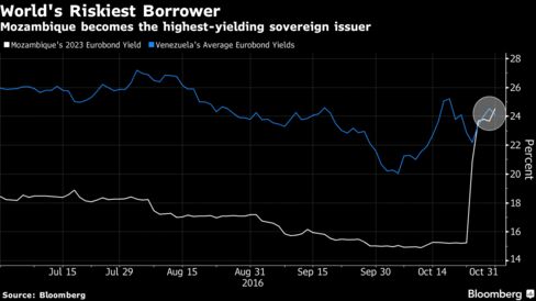 Mozambique has overtaken Venezuela as the world’s riskiest issuer of dollar-denominated bonds. The southern African country told investors on Oct. 24 it needed to restructure its commercial debt, sending yields on its 2023 Eurobonds soaring about 900 basis points to 24.5 percent. Holders of the securities have lost 24 cents in the dollar.