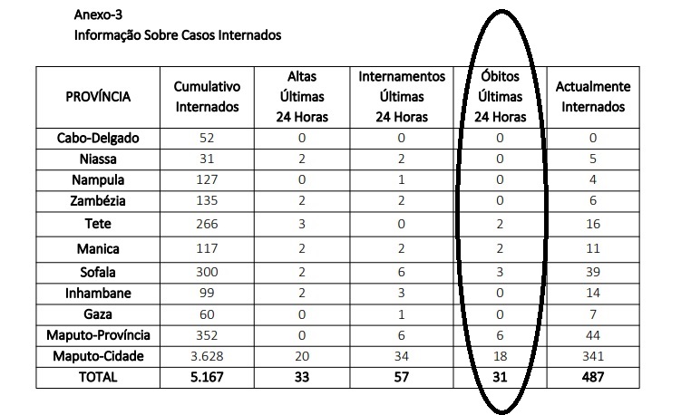 Largely because of the 31 deaths, the number of people under medical care in the Covid-19 treatment centres fell from 494 on Wednesday to 487 on Thursday, The great majority of these cases – 341 (70 per cent) were in Maputo. There were also 44 patients in Matola, 39 in Sofala, 16 in Tete, 14 in Inhambane, 11 in Manica, seven in Gaza, six in Zambezia, five in Niassa, and four in Nampula. Cabo Delgado remained the only province with no Covid-19 patients hospitalised.