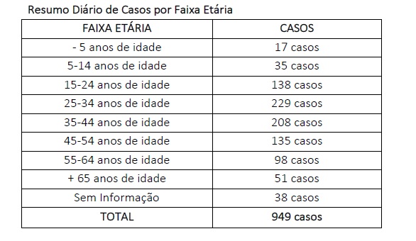 Of the 949 newly diagnosed cases, reported this Sunday, 942 are Mozambicans, five are foreigners and the nationalities of two others are yet to be determined; 527 (55.5%) are women or girls and 422 (44.5%) are men or boys . All the new cases reported today are local transmissions.