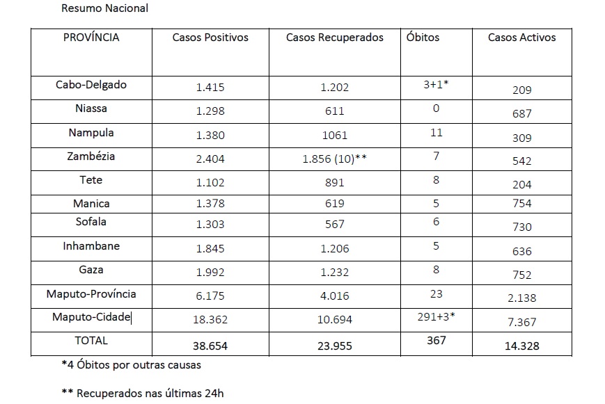 The Ministry of Health also reported 949 newly diagnosed cases,bringing the cumulative number of confirmed Covid-19 cases in Mozambique since the outbreak to 38.654,.