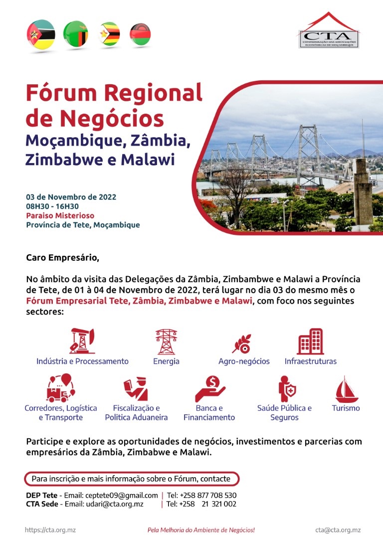 The Mozambique, Zambia, Zimbabwe and Malawi Regional Business Forum will take place in Tete city on November 3 (Thursday of next week), the Confederation of Economic Associations of Mozambique (CTA) has announced.