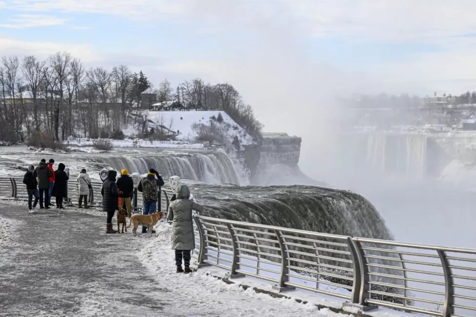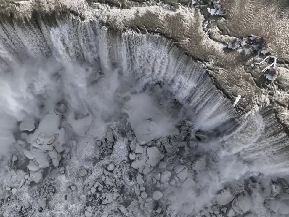 Cascades of water could still be seen thundering down the falls, situated on the US-Canada border, in spite of the frozen areas.