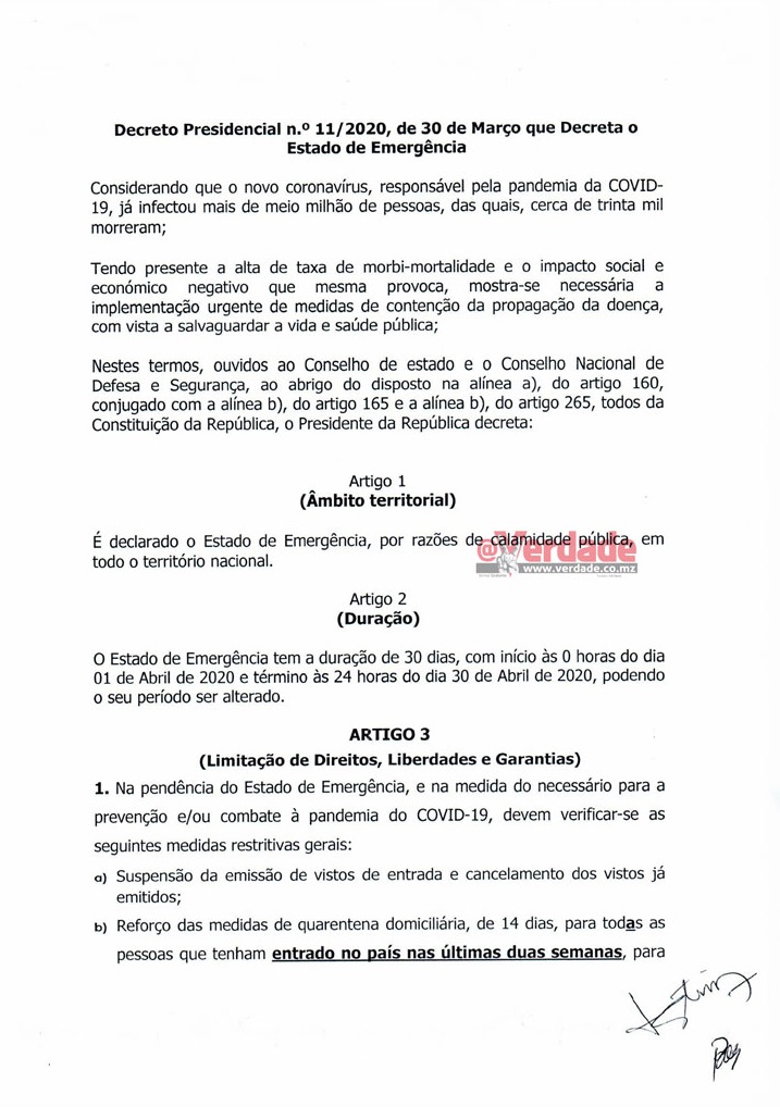 The Assembly of the Republic ratified the Declaration of the State of Emergency in Mozambique late on Tuesday (31/03), to start as of 00:00 on April 1. Parliament had previously instructed the Minister of Justice, Constitutional and Religious Affairs to rectify the Decree signed by Filipe Nyusi, as it violated certain constitutional rights and gave excessive powers to the government, @Verdade reports.