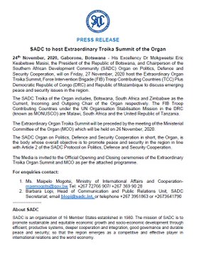 His Excellency Dr Mokgweetsi Eric Keabetswe Masisi, the President of the Republic of Botswana, and Chairperson of the Southern African Development Community (SADC) Organ on Politics, Defence and Security Cooperation, will on Friday, 27 November, 2020 host the Extraordinary Organ Troika Summit, Force Intervention Brigade (FIB) Troop Contributing Countries (TCC) Plus Democratic Republic of Congo (DRC) and Republic of Mozambique to discuss emerging peace and security issues in the region.
