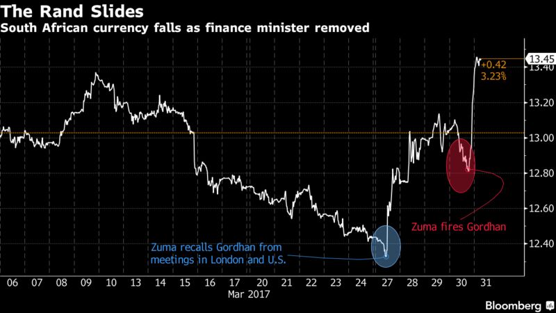 The rand was down 2.1 percent at 13.567 per dollar as of 2:09 p.m. in Tokyo trading, the weakest in two months. The currency was heading for a 9 percent loss for the week — the worst such performance since the last time Zuma rocked markets with a finance-minister firing. Back in December 2015, it was Nhlanhla Nene’s ouster that hurt confidence — an episode that ended with Zuma bringing back the respected Gordhan to office.