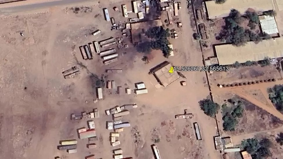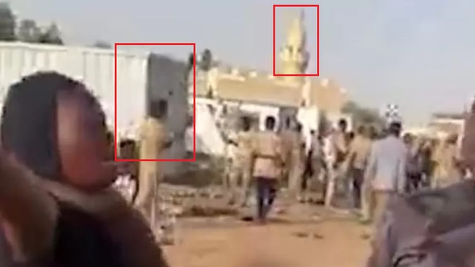 From visual clues in the video, including the minaret of a mosque in the background and what looks like a shipping container, the BBC has pinpointed the site to an area of central Khartoum near the university campus and a sports stadium.