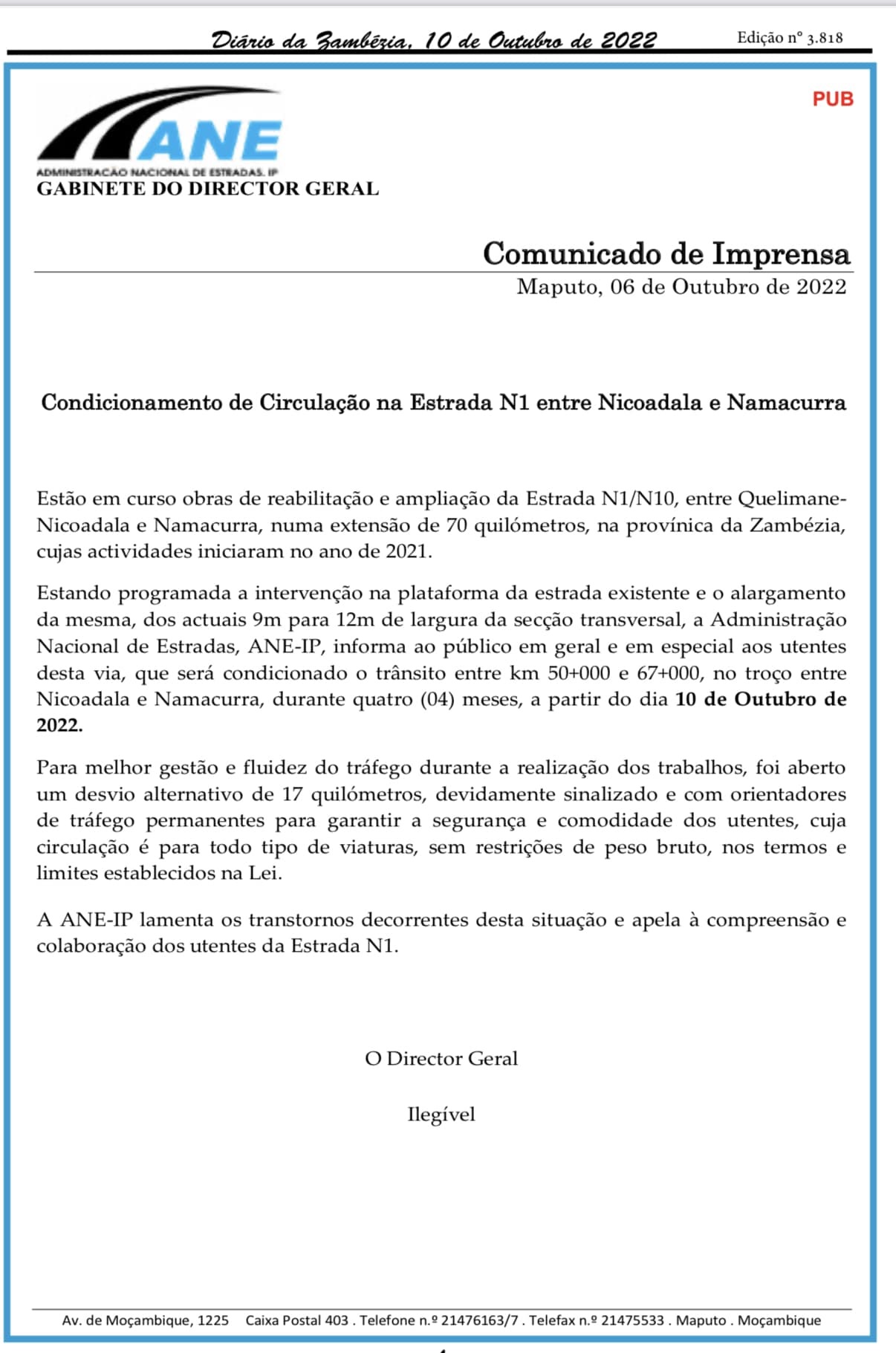 A National Road Administration (ANE) announcement states that the restrictions, affecting the road between Quinta do Girassol Nicoadala to the district headquarters town, may last up to four months.