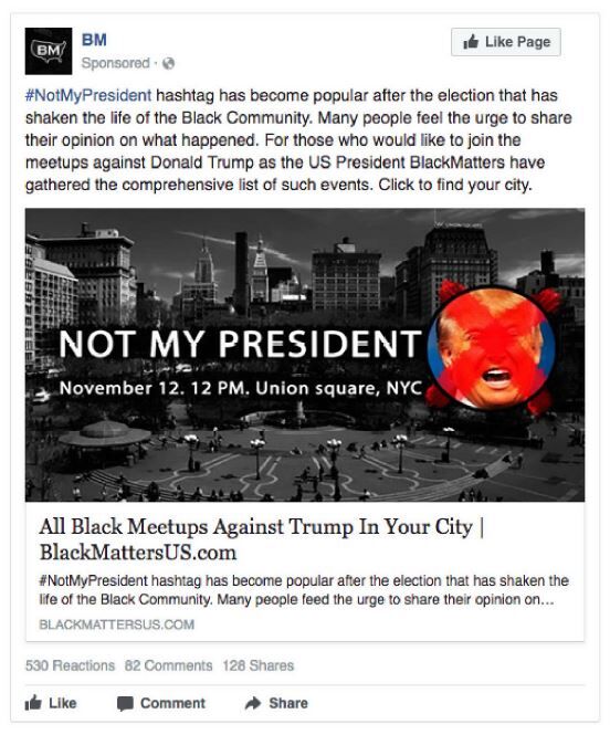 Around the same time through different channels, Russia promoted rallies against the president-elect. The BM page, which provided Facebook distribution for the website blackmattersUS.com, advertised a list of anti-Trump meetups, using the #NotMyPresident hashtag. One of those ads, which cost 1,378 rubles, was targeted toward people who said they liked Martin Luther King, Jr. and Malcolm X. More than 10,000 people saw it and 1,310 of them clicked.