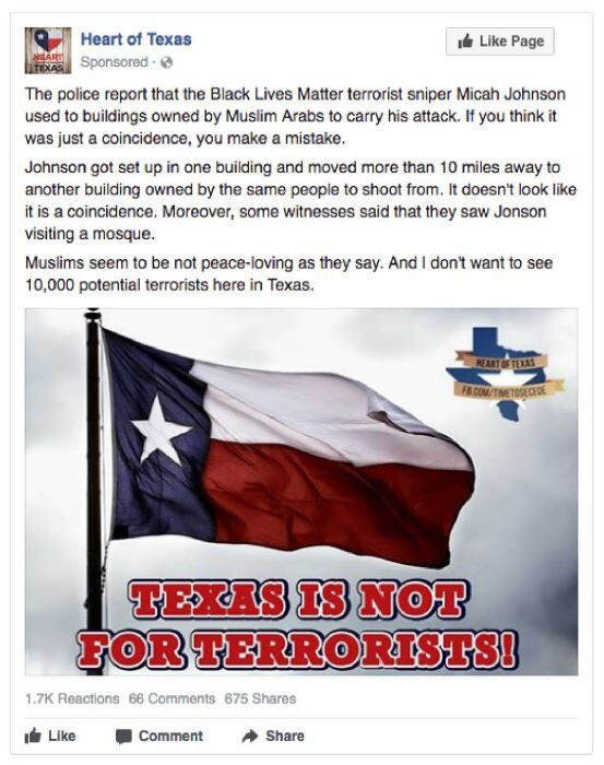 That ad was aimed at people who identified themselves patriotic, and aimed to get likes for the Russian-run page, Heart of Texas, which organized anti-Muslim activism. It was shared 675 times. Ads on another page around the same time encouraged Muslims to let everyone know they didn’t support terrorism. One of those ads, from the Russian page United Muslims of America, got 576 shares.