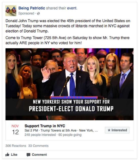 Even after Trump was elected, Russians continued to use social media to stir unrest. The page Being Patriotic paid 1,999 rubles for an ad on Nov. 10 that promoted a Trump rally: “Today some massive crowds of libtards marched in NYC against election of Donald Trump.” The ad said people should gather at Trump Tower the Saturday after the election: “Show Mr. Trump there actually ARE people in NY who voted for him!”