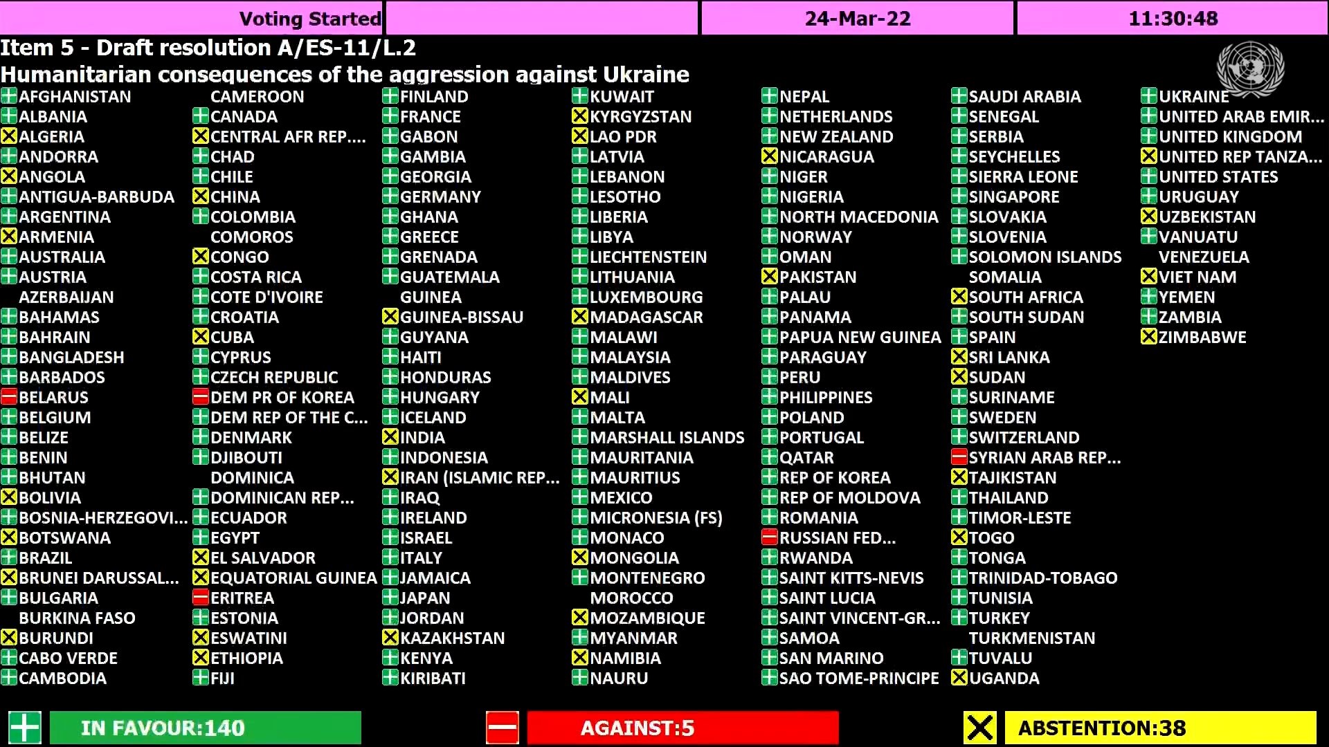Draft resolution A/ES-11/L.2 condemning Russia’s violations of international humanitarian and human rights law in #Ukraine 🇺🇦 overwhelmingly passes in the @UN General Assembly: