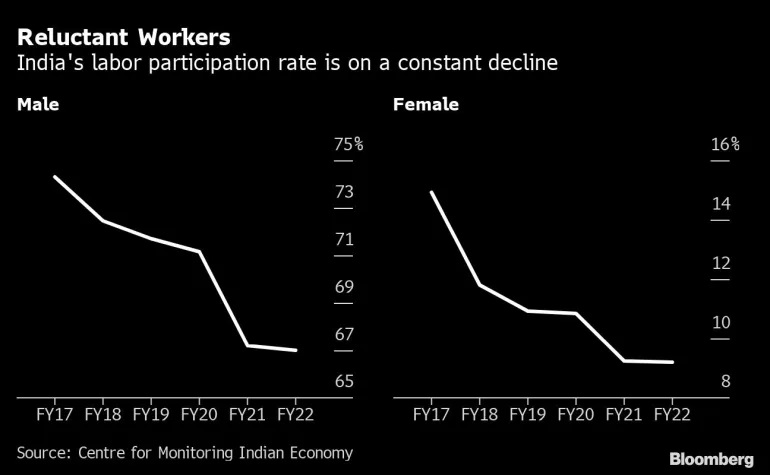 With India betting on young workers to drive growth in one of the world’s fastest-expanding economies, the latest numbers are an ominous harbinger. Between 2017 and 2022, the overall labor participation rate dropped from 46% to 40%. Among women, the data is even starker. About 21 million disappeared from the workforce, leaving only 9% of the eligible population employed or looking for positions.