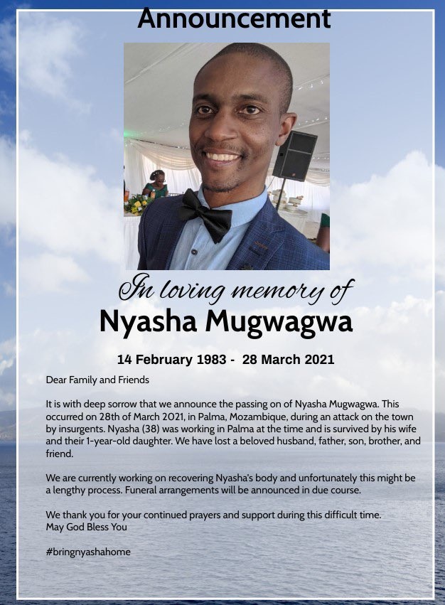 Shutting down a missing person appeal on social media Monday, the family said it had been established that Nyasha who was a catering manager for Remote Site Solutions at the multibillion-dollar gas projects being built by France’s Total and other energy companies died on March 28. Said the family: